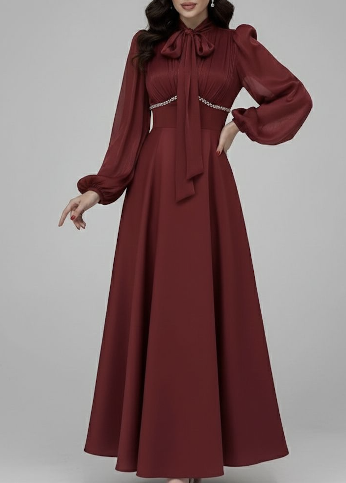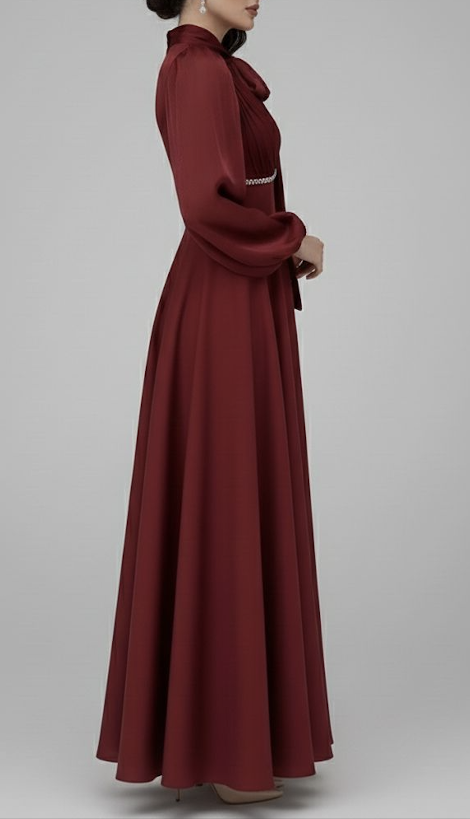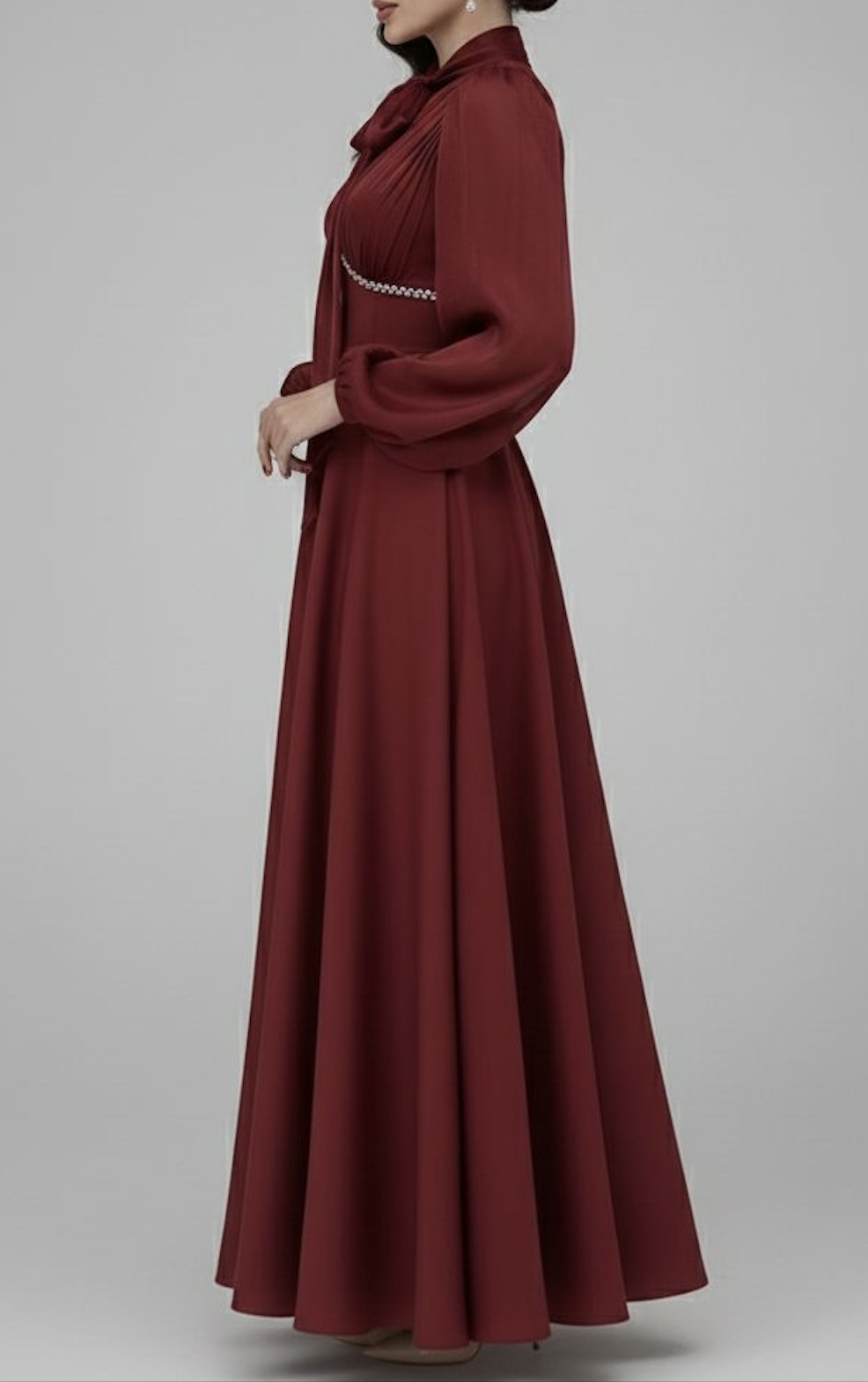 Sophistication in every stitch. Channel timeless elegance with this deep burgundy masterpiece. Featuring a modest high neck secured by a chic pussy-bow tie, this gown bridges the gap between vintage charm and modern luxury. The pleated bodice is cinched by a delicate crystal-embellished waistline, flowing effortlessly into a soft, matte skirt. It’s the perfect blend of power and poise.