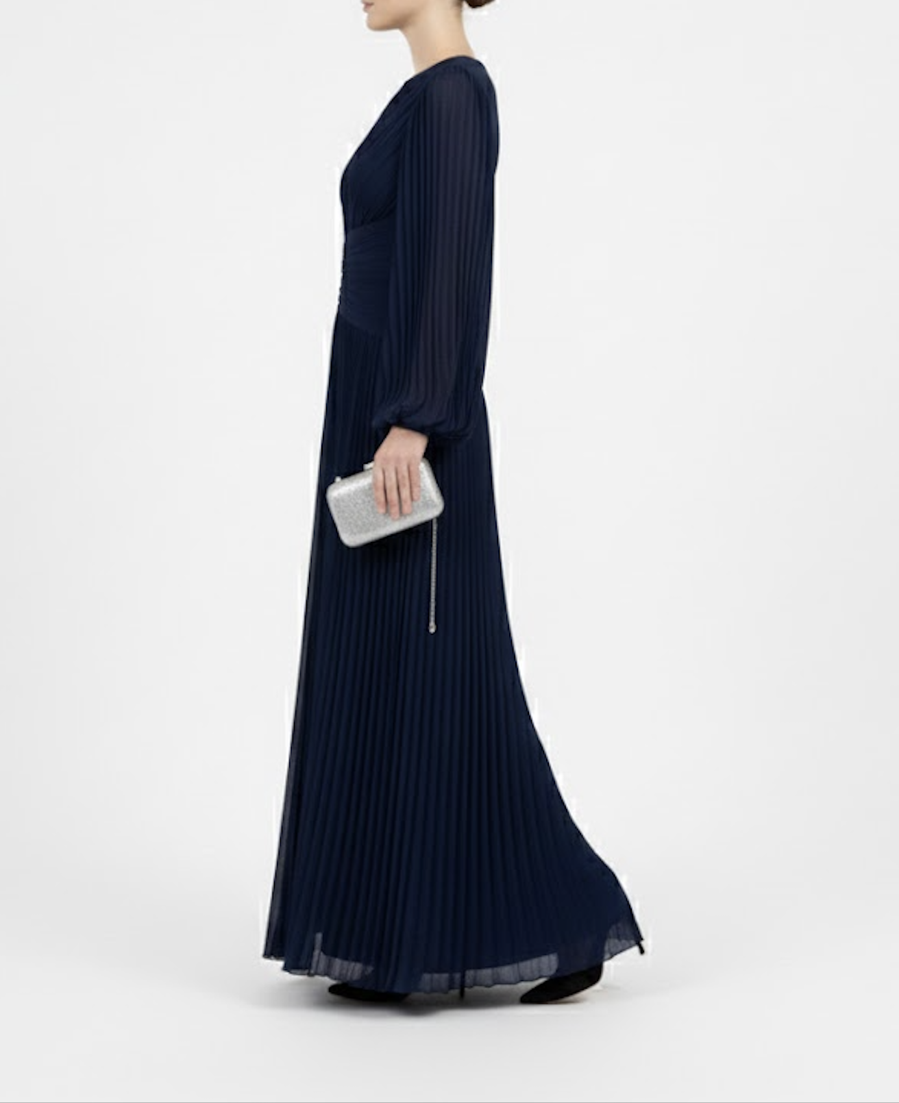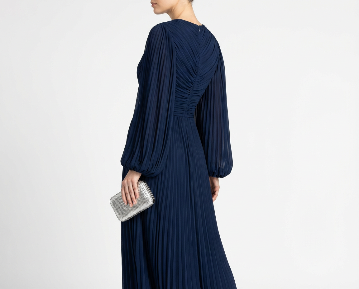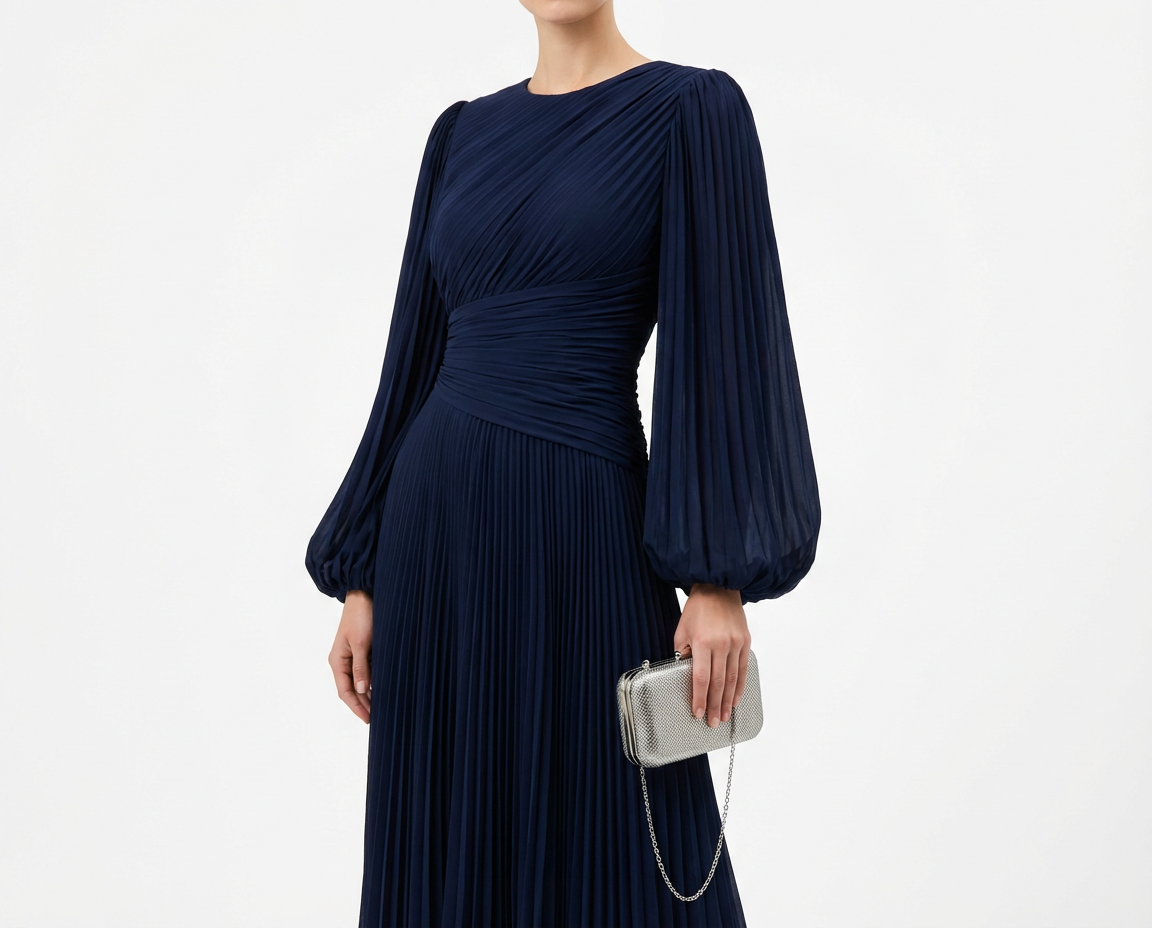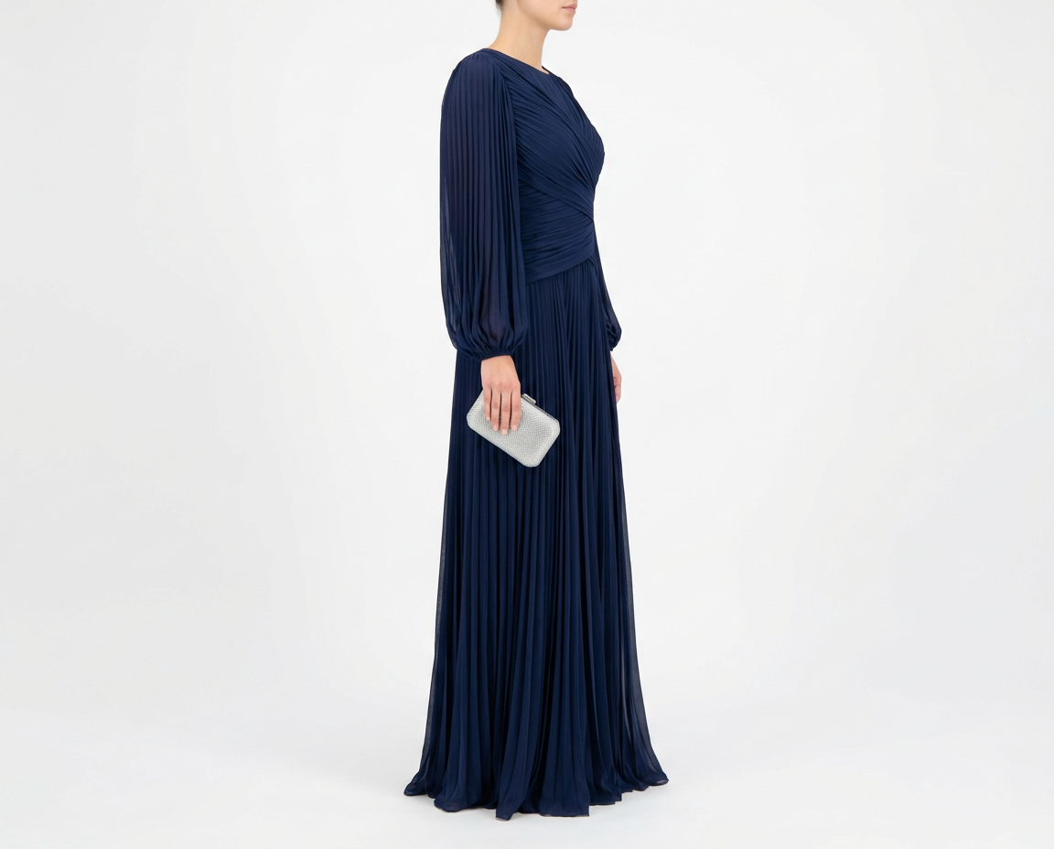 Exude understated grace in this mesmerizing deep navy gown, a masterclass in texture and modest elegance. The bodice is artfully constructed with diagonal ruching that wraps across the torso, creating a sophisticated, fluid movement. This draped detailing flows seamlessly into a floor-length sunray-pleated skirt that sways beautifully with every step. With its rich color and romantic silhouette, this dress strikes the perfect balance between modern style and timeless grandeur.