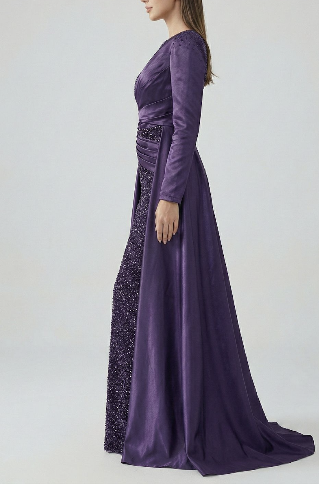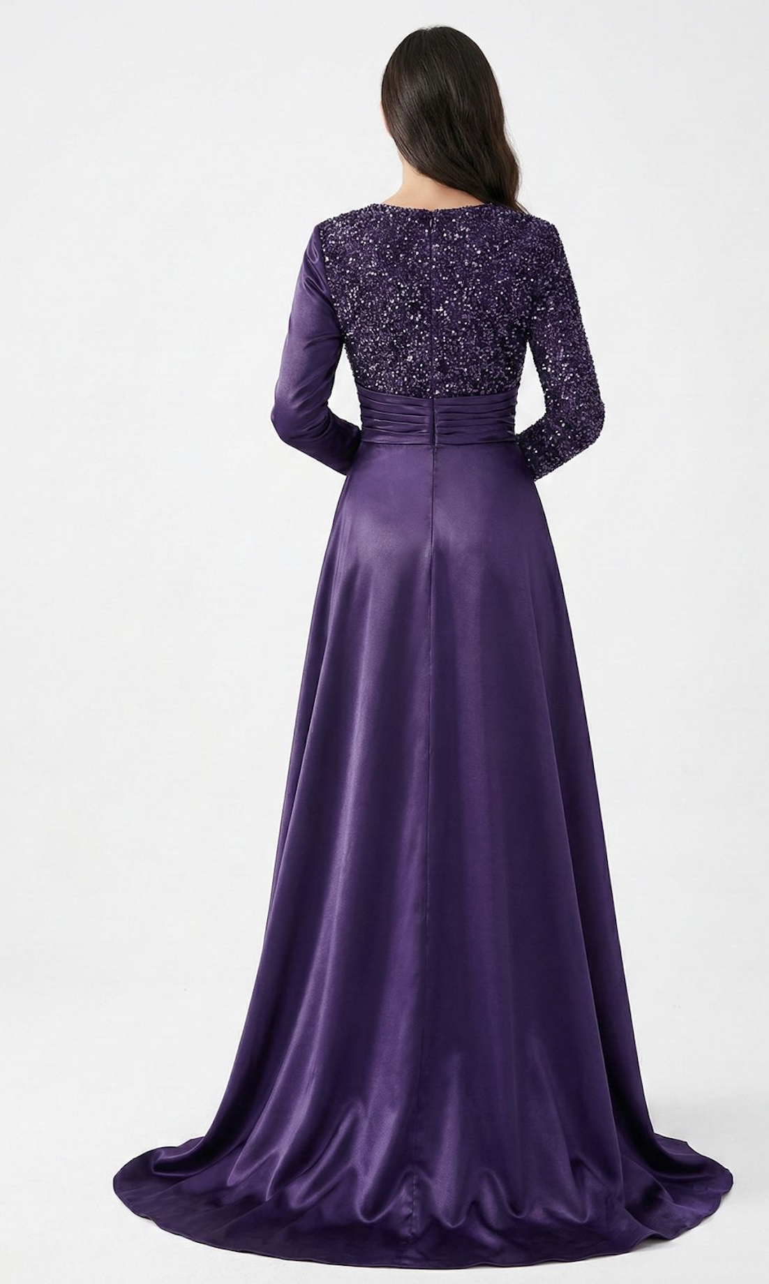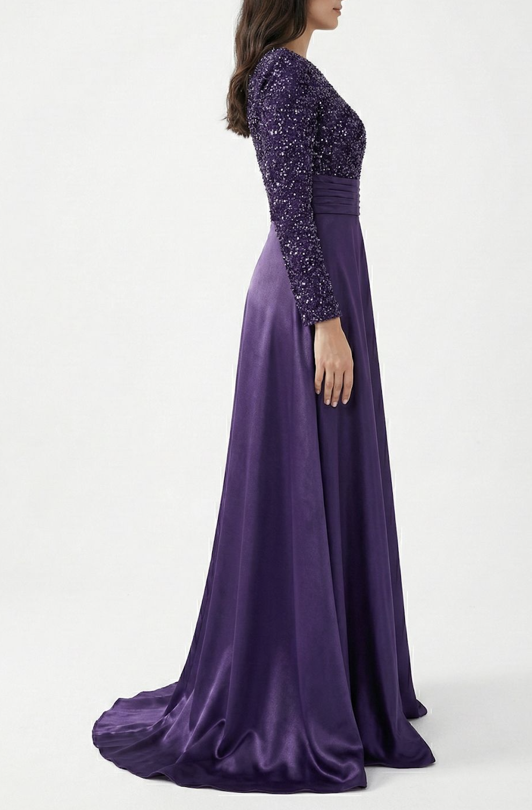 Make a truly unforgettable entrance in this exquisite deep purple evening gown. Designed for the woman who commands attention, this floor-length dress is a stunning blend of shimmering detail and luxurious texture, perfect for formal events, galas, and black-tie affairs.