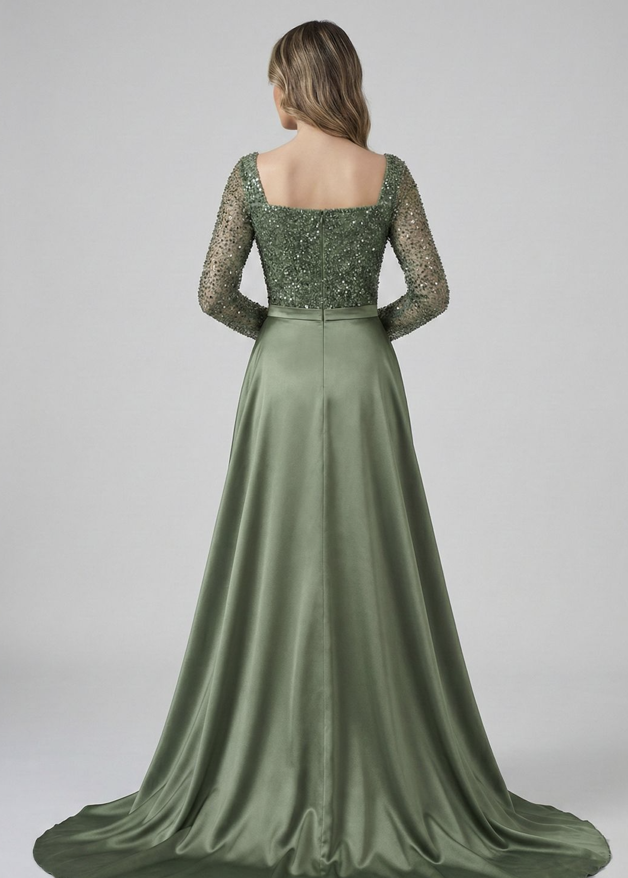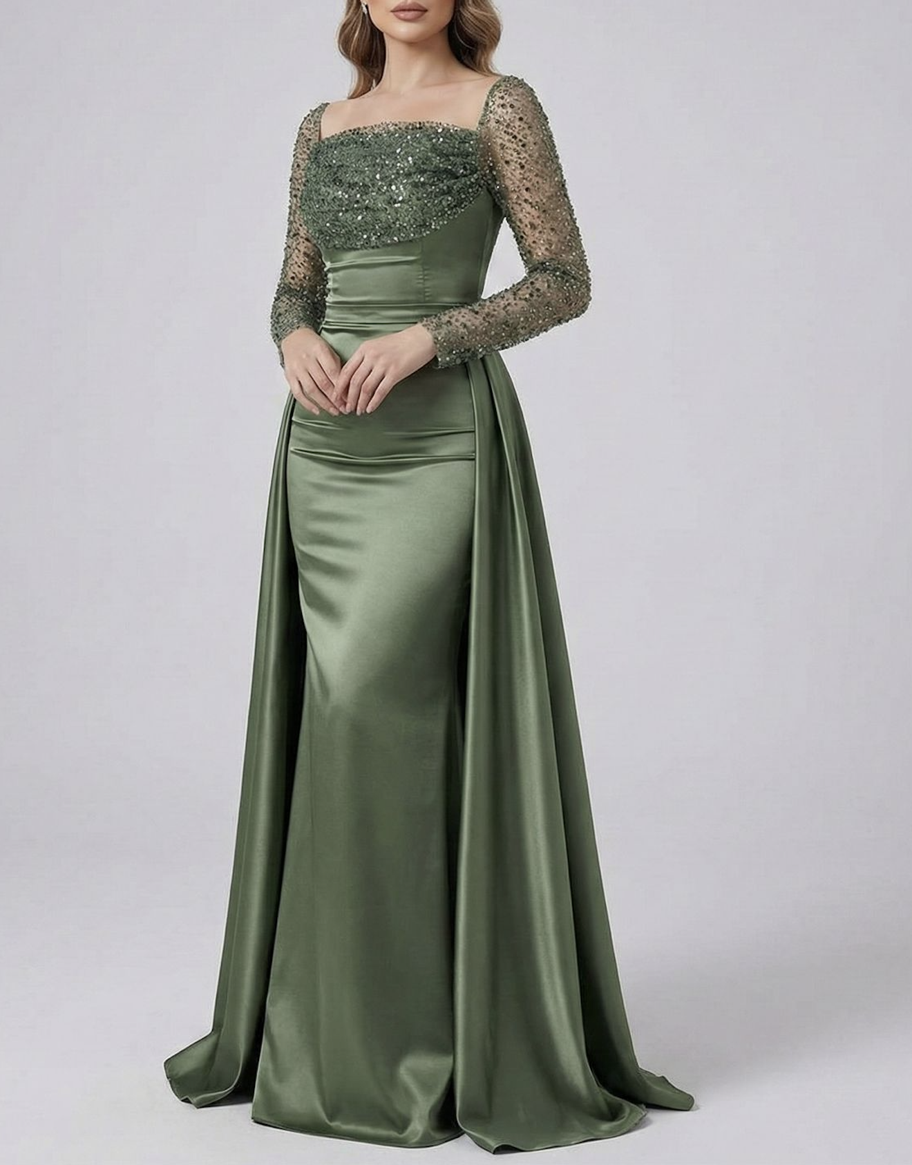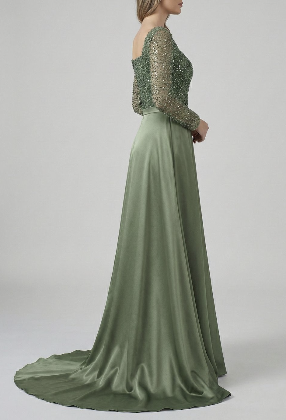 Sage Satin & Sequin Overlay Evening Dress with Train