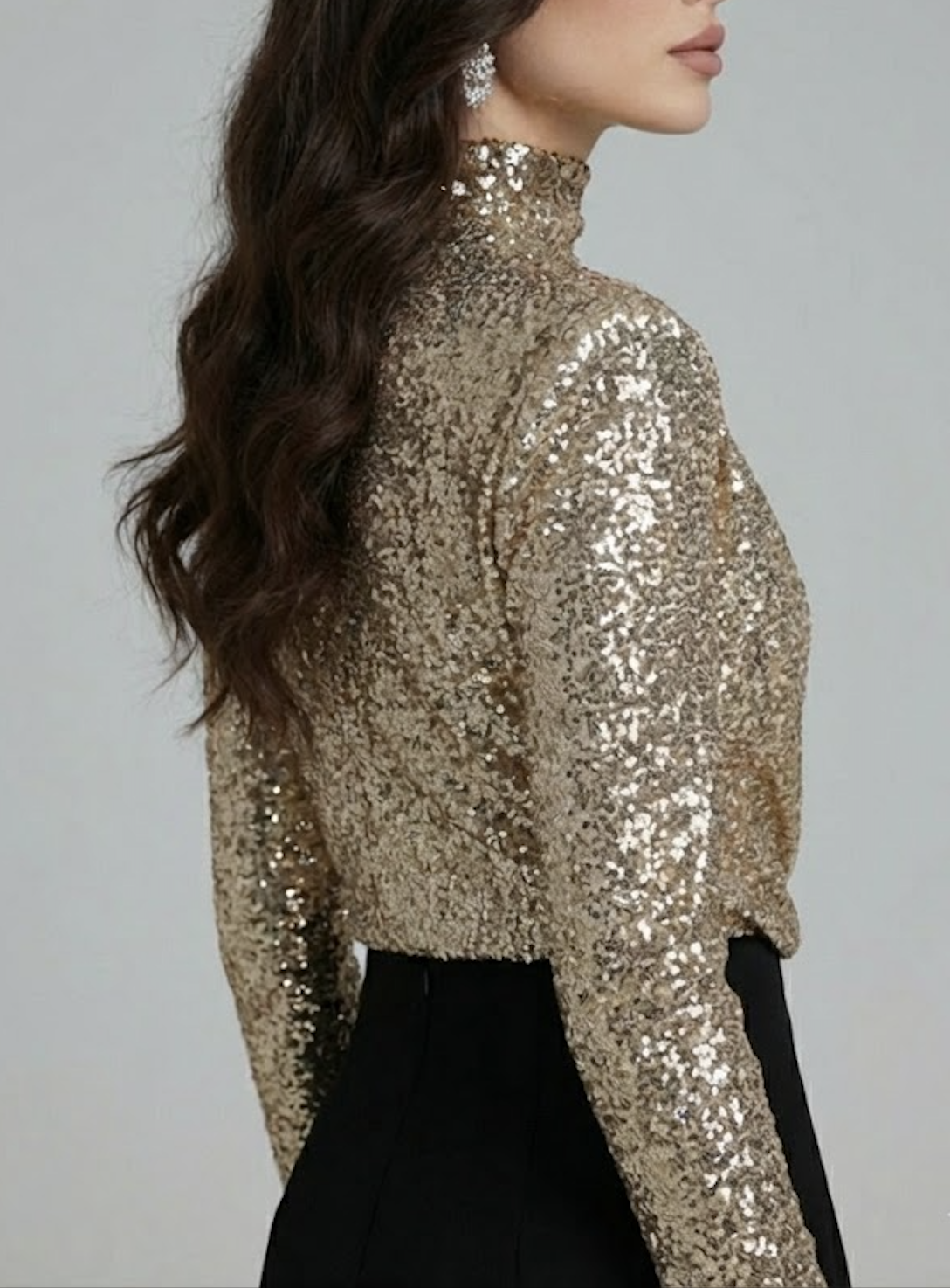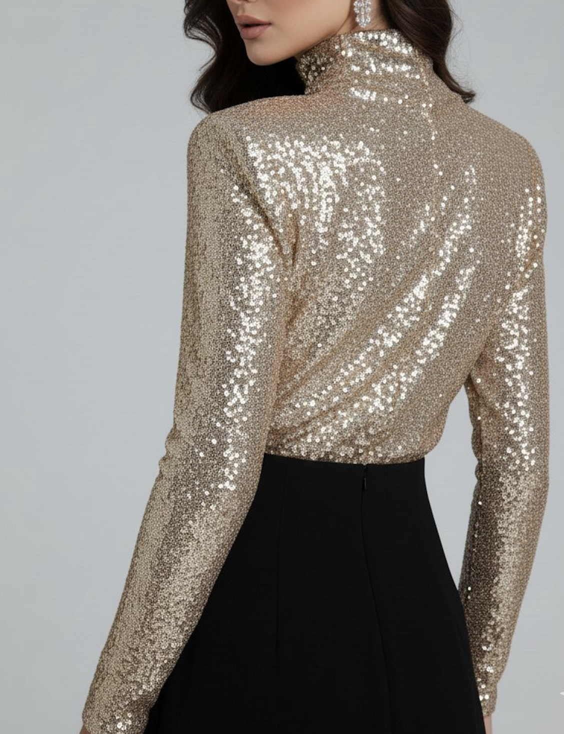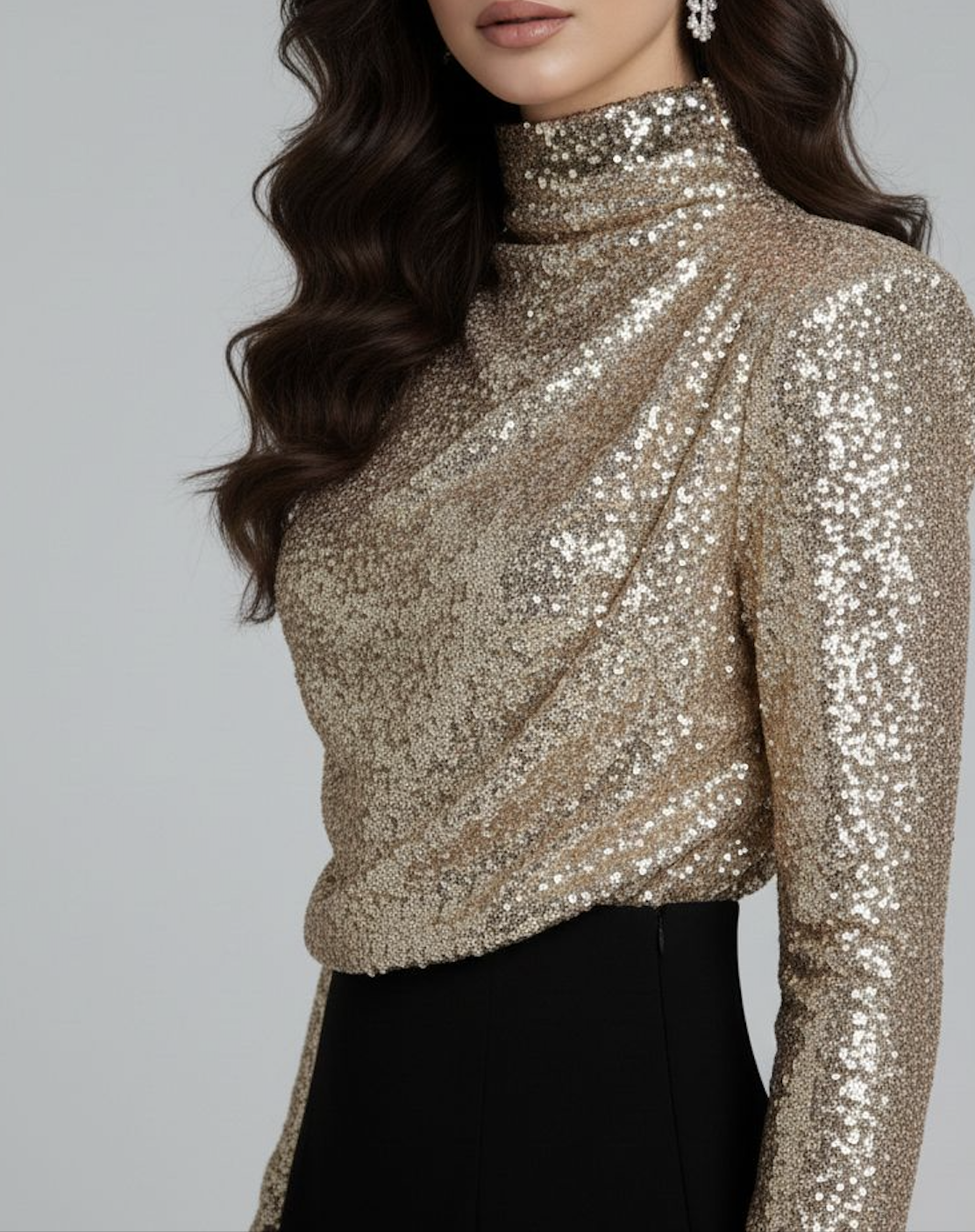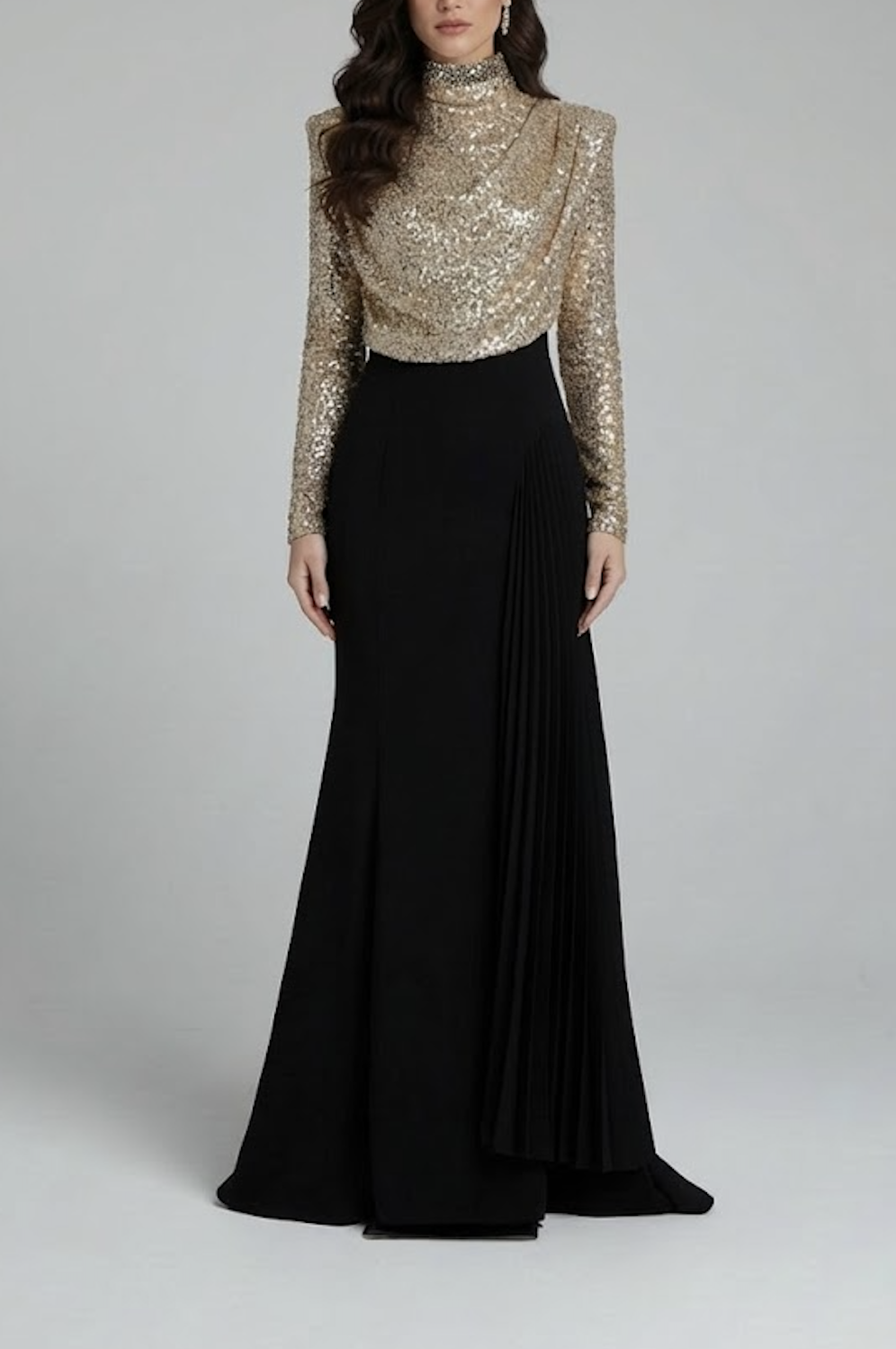 For the woman who means business. This two-tone architectural marvel features a slouchy, cowl-neck bodice dripping in gold sequins, contrasted against a sharp, tailored black skirt. The skirt features a unique side-pleated panel that adds movement and high-fashion structure. It is bold, statuesque, and undeniably expensive-looking.