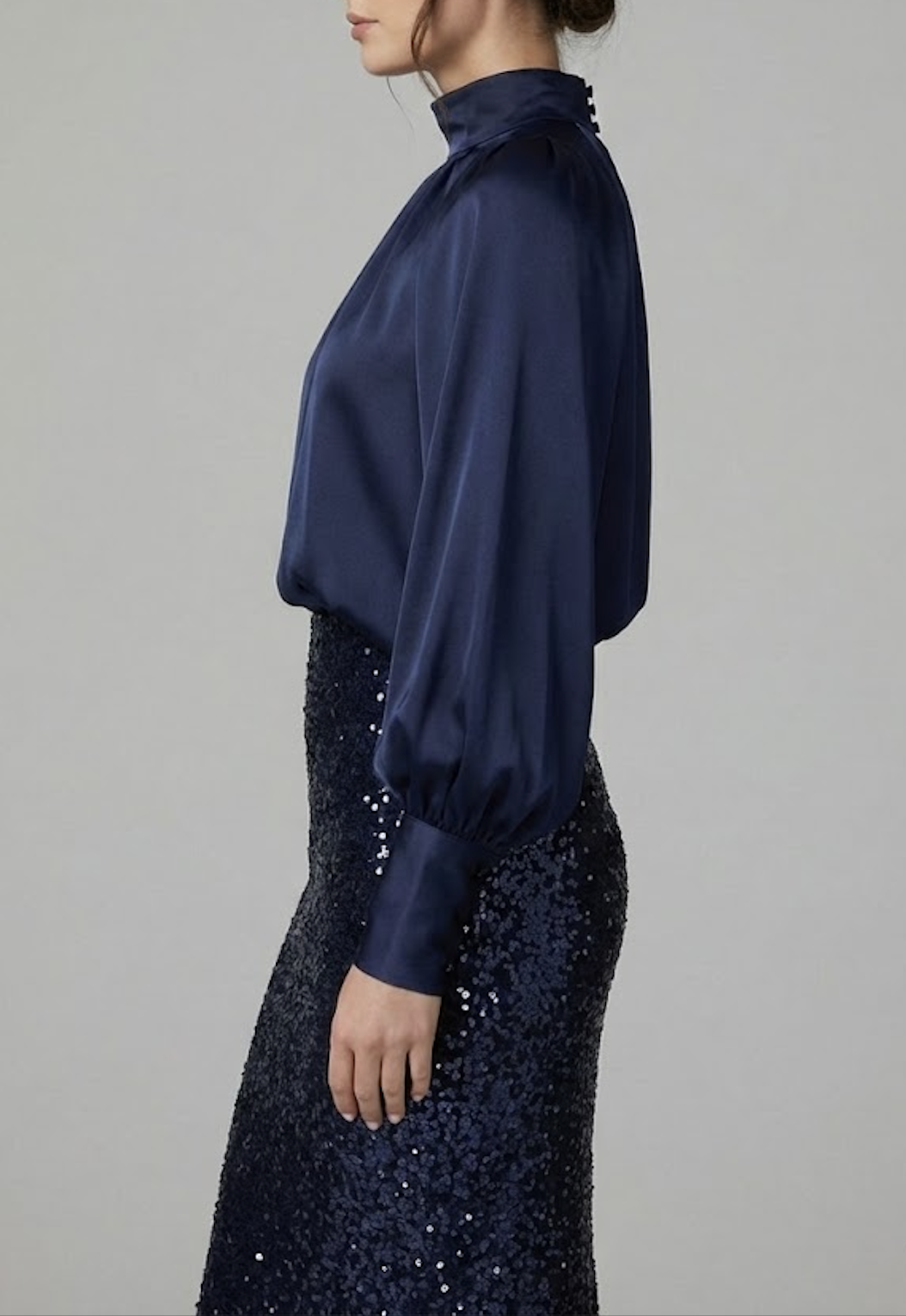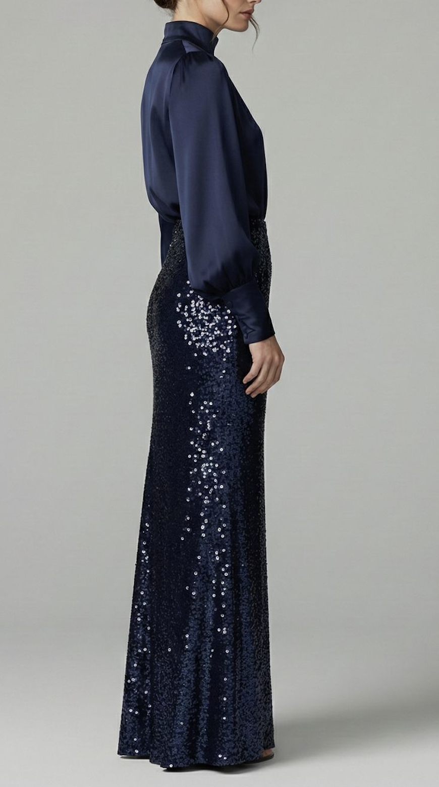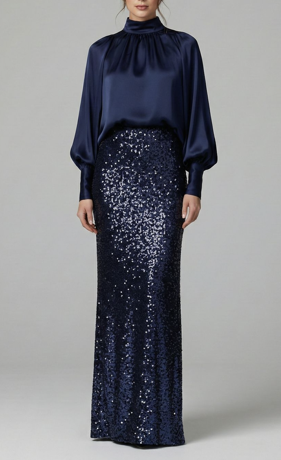 Matte meets magic. A study in stunning contrasts. This gown pairs the rich, buttery feel of a high-neck satin blouse with the high-voltage glamour of a fully sequined skirt. The blouson sleeves add a touch of vintage sophistication, while the shimmering column skirt ensures you catch the light from the waist down. It’s “rich mom” energy in a dress.