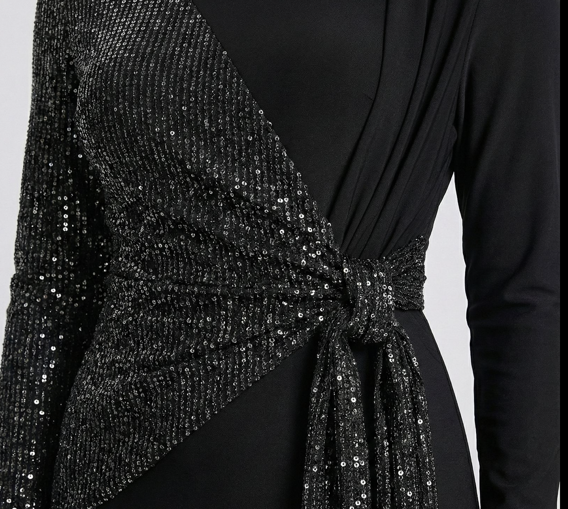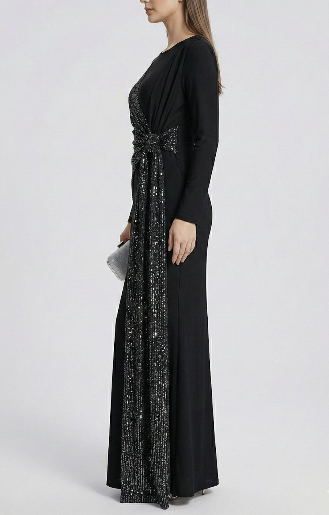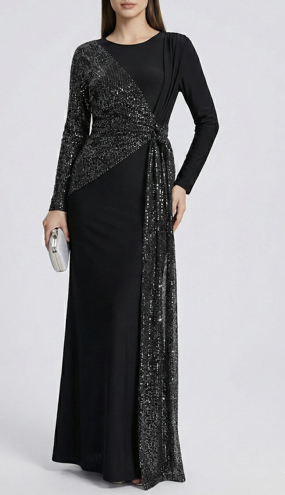 A study in dramatic contrast. Turn heads with this striking floor-length gown that plays with texture and light. The design features a bold asymmetrical silhouette, pairing a sleek, solid black bodice on one side with a dazzling, fully sequined long sleeve on the other. A diagonal sash of sequins cuts across the waist and cascades down the skirt, creating a figure-flattering line that elongates the body. It is the ultimate choice for black-tie events where you want to shine.